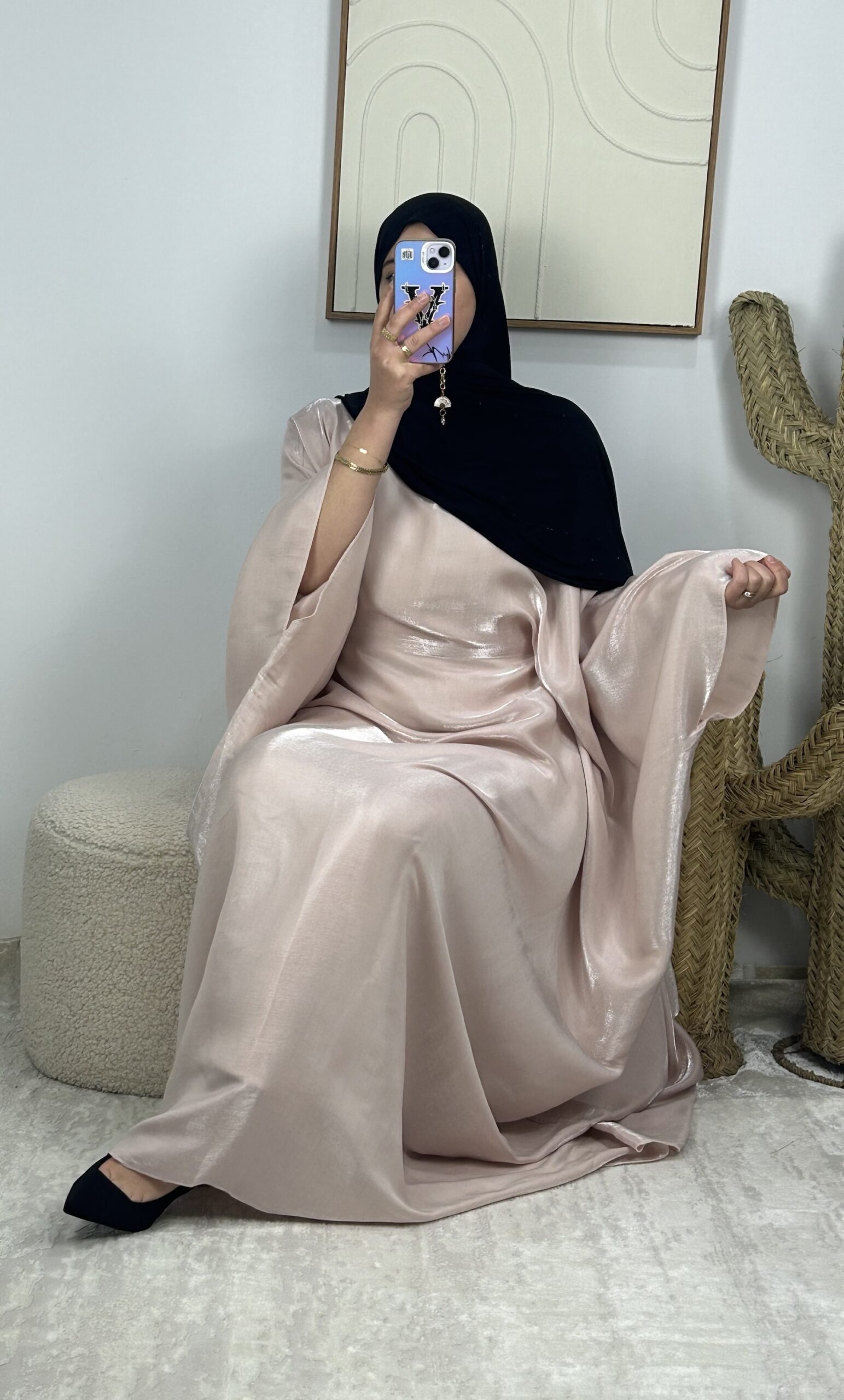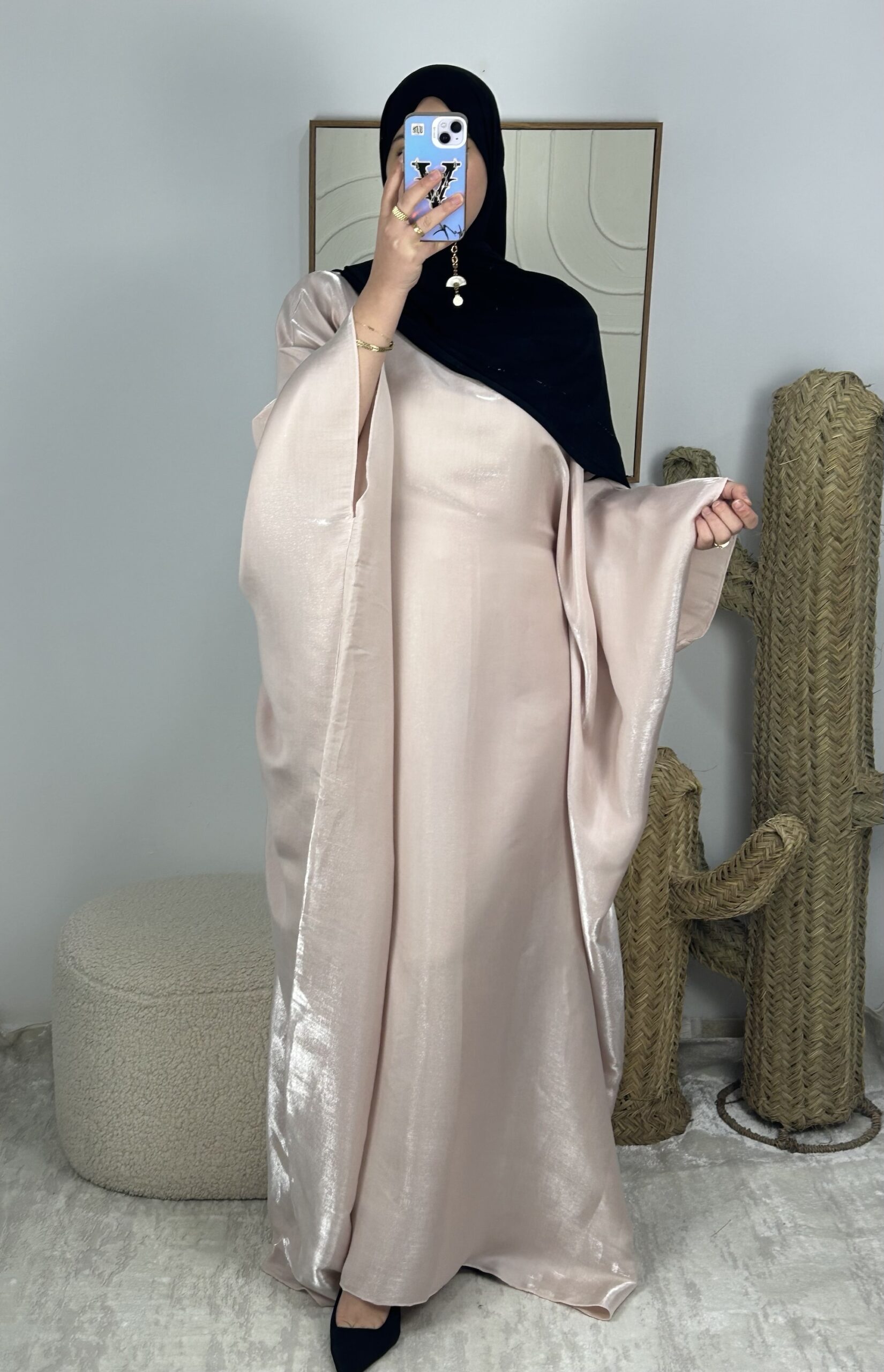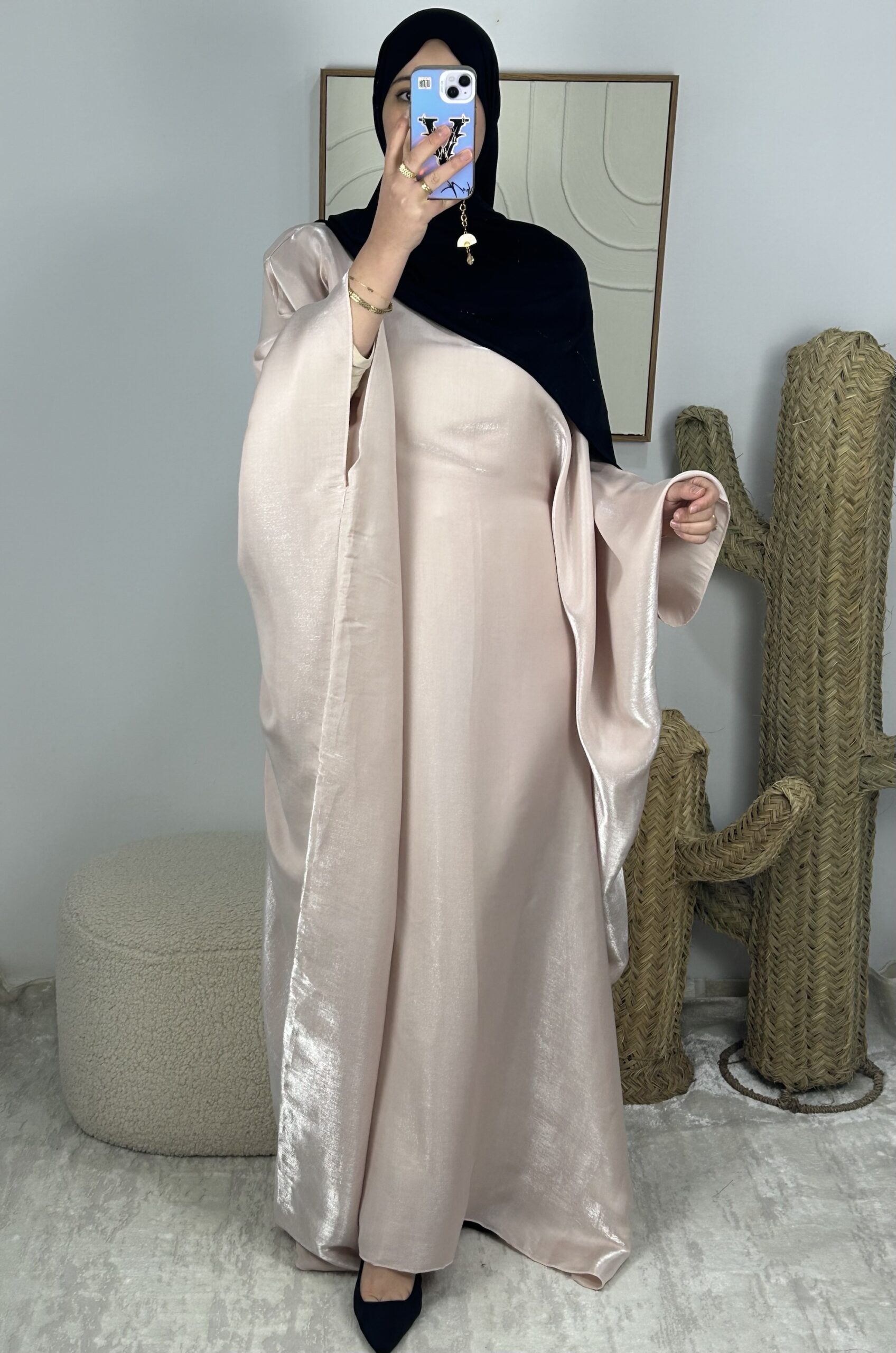 Abaya estilo mariposa con cinturón integrado en el interior del vestido.